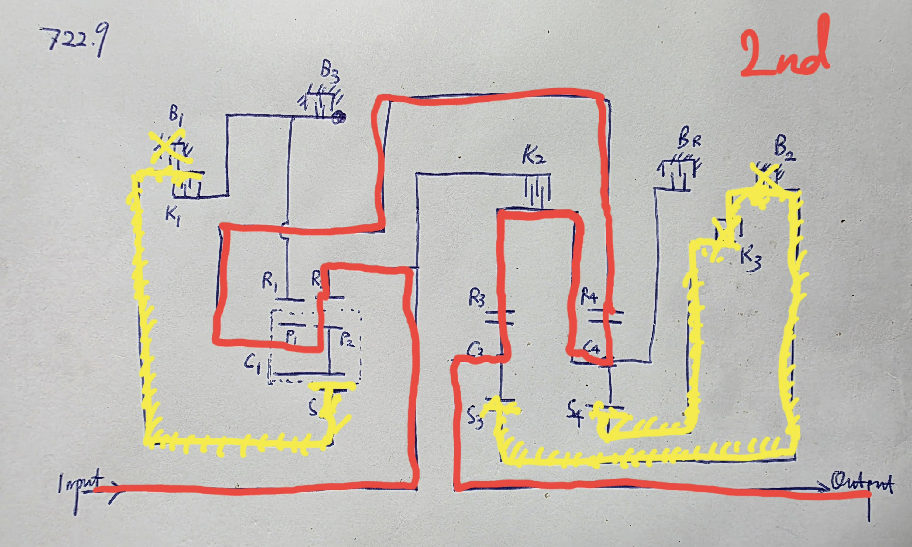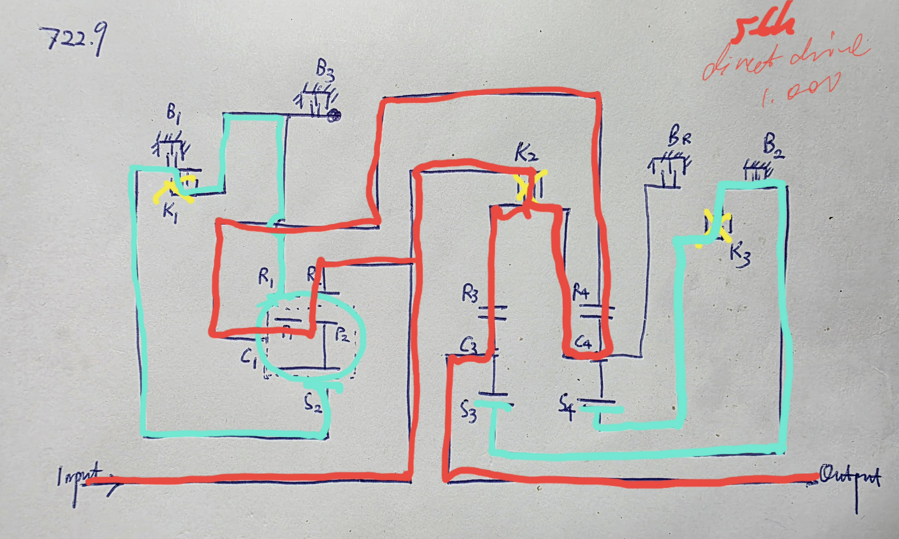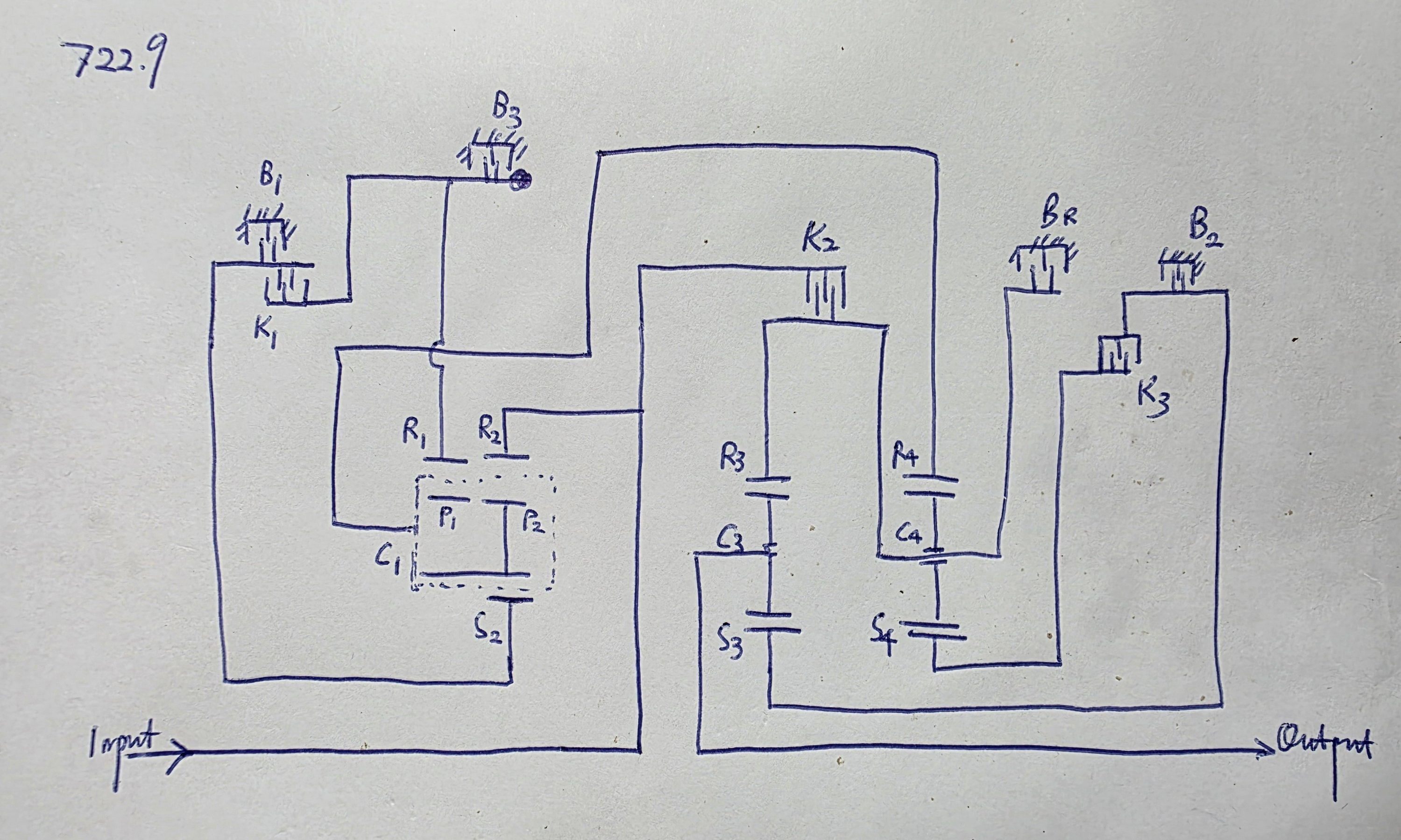 Let us now move our attention to the schematic of the gear train, which was drawn by me. K1 through K3 are the clutches, B1 through B3 the brakes, and BR the reverse brake, which is not used in the forward gears. C1 through C4 are the planet carriers, S2 through S4 the sun gears, and R1 through R4 the ring gears. I also marked out P1 and P2 as the two sets off pinons in the Ravigneaux gearset. Several points are worth noting: