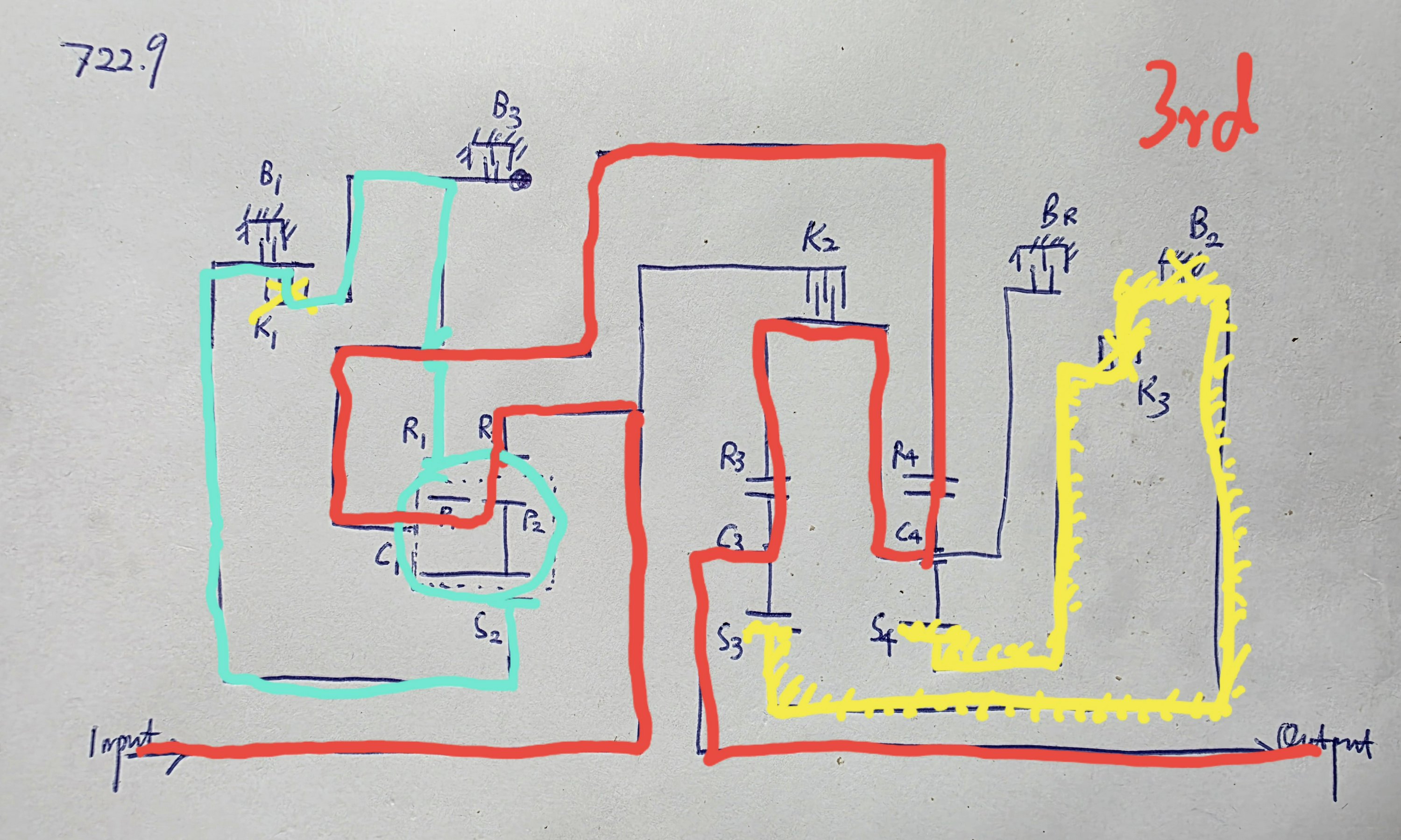 In 3rd, torque goes through R2 > C1 > R4 > C4 > R3 > C3. Because K1 connects S2 to R1, it locks the Ravigneaux gearset as one. There is no speed reduction until power reaches the rear planetary gearsets.