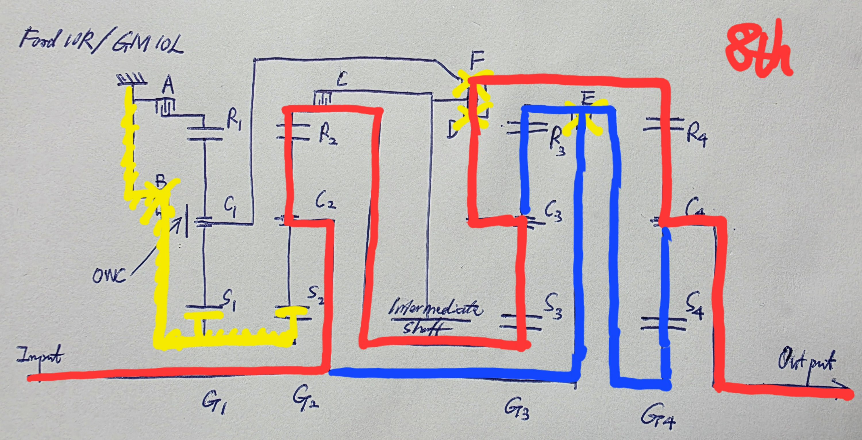 In 8th, torque goes through C2 > R2 > S3 > D > F > R4 > C4. Speed increases in G2 but is then reduced in G3 and G4.
