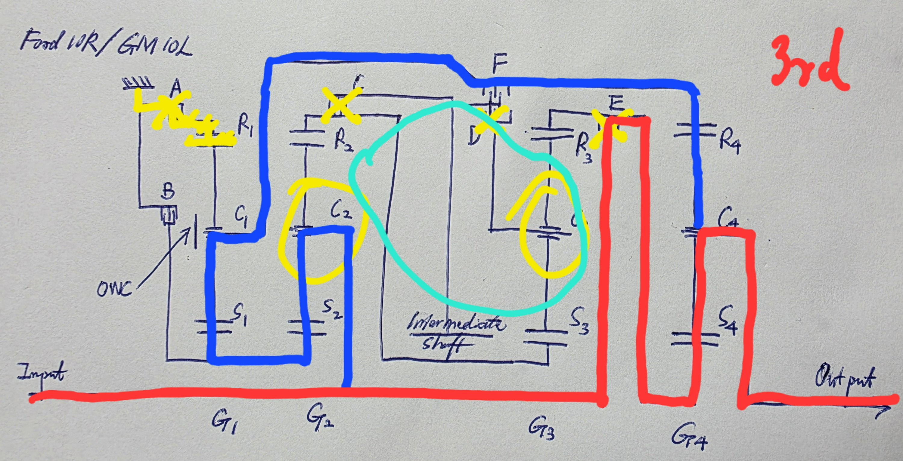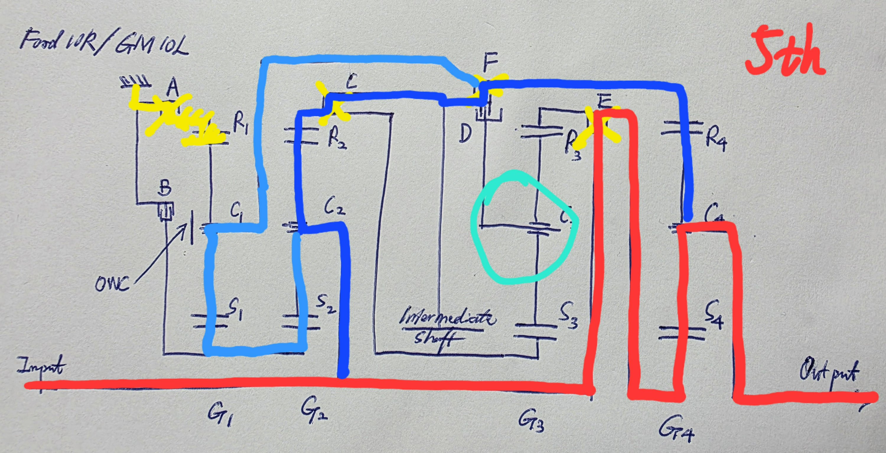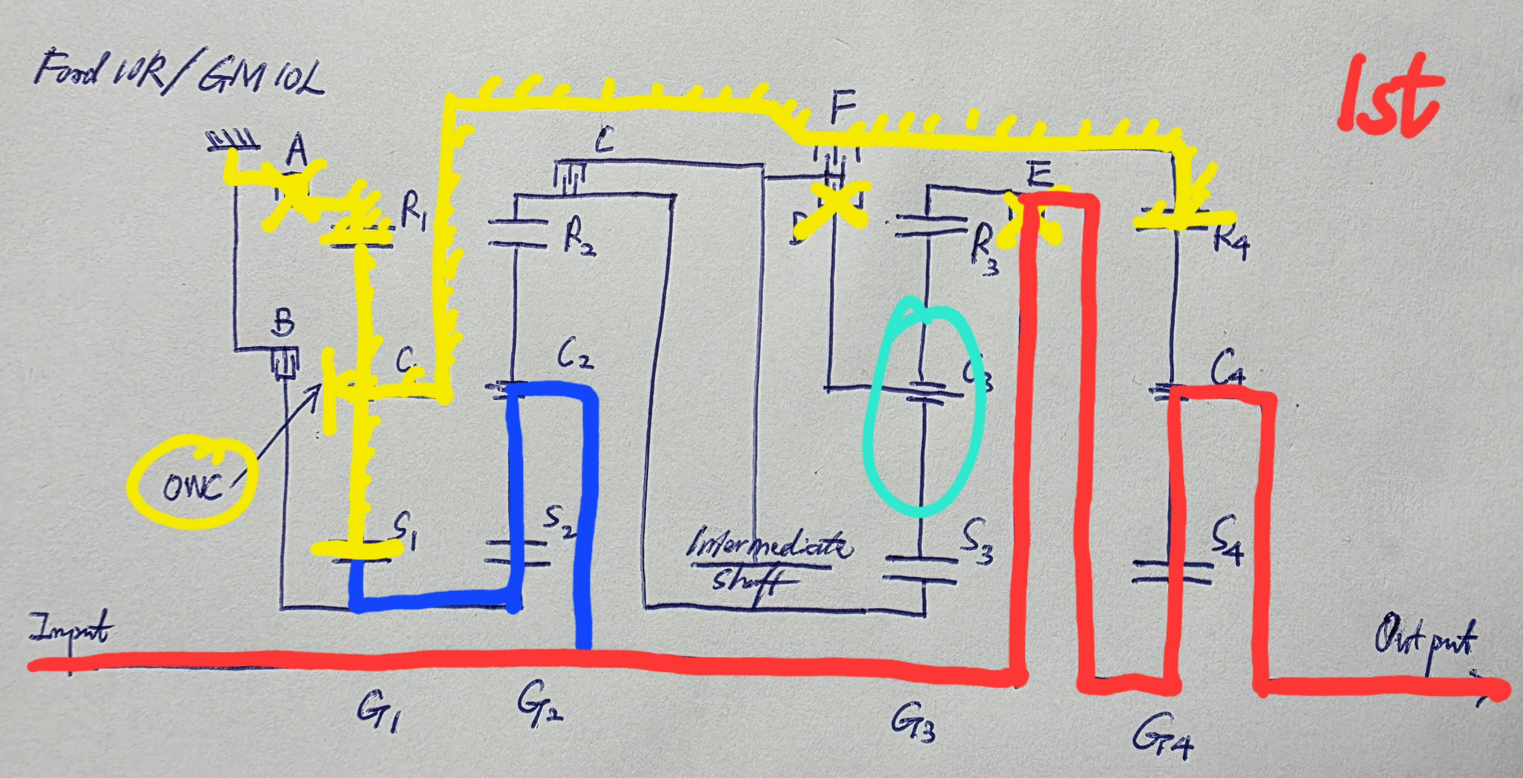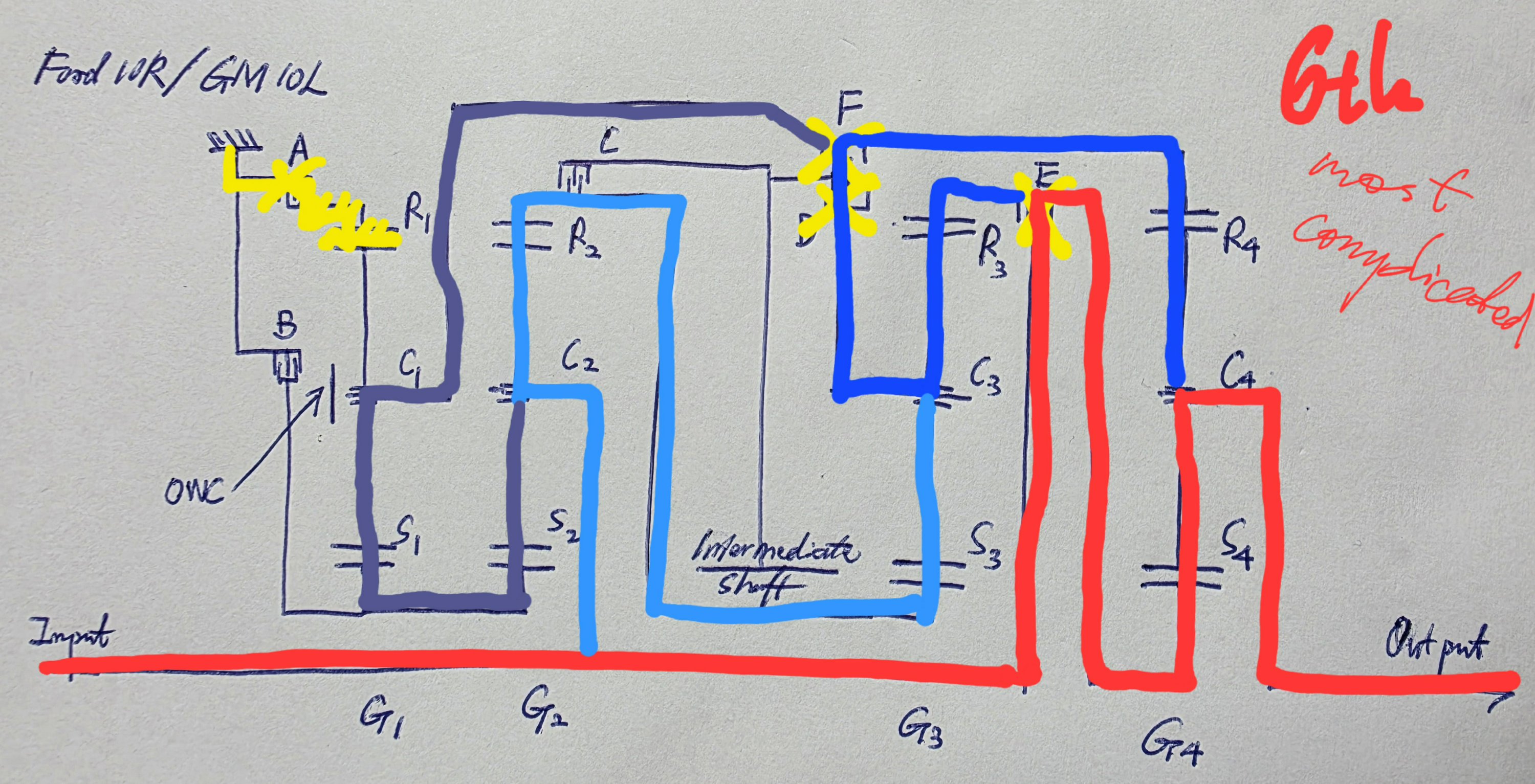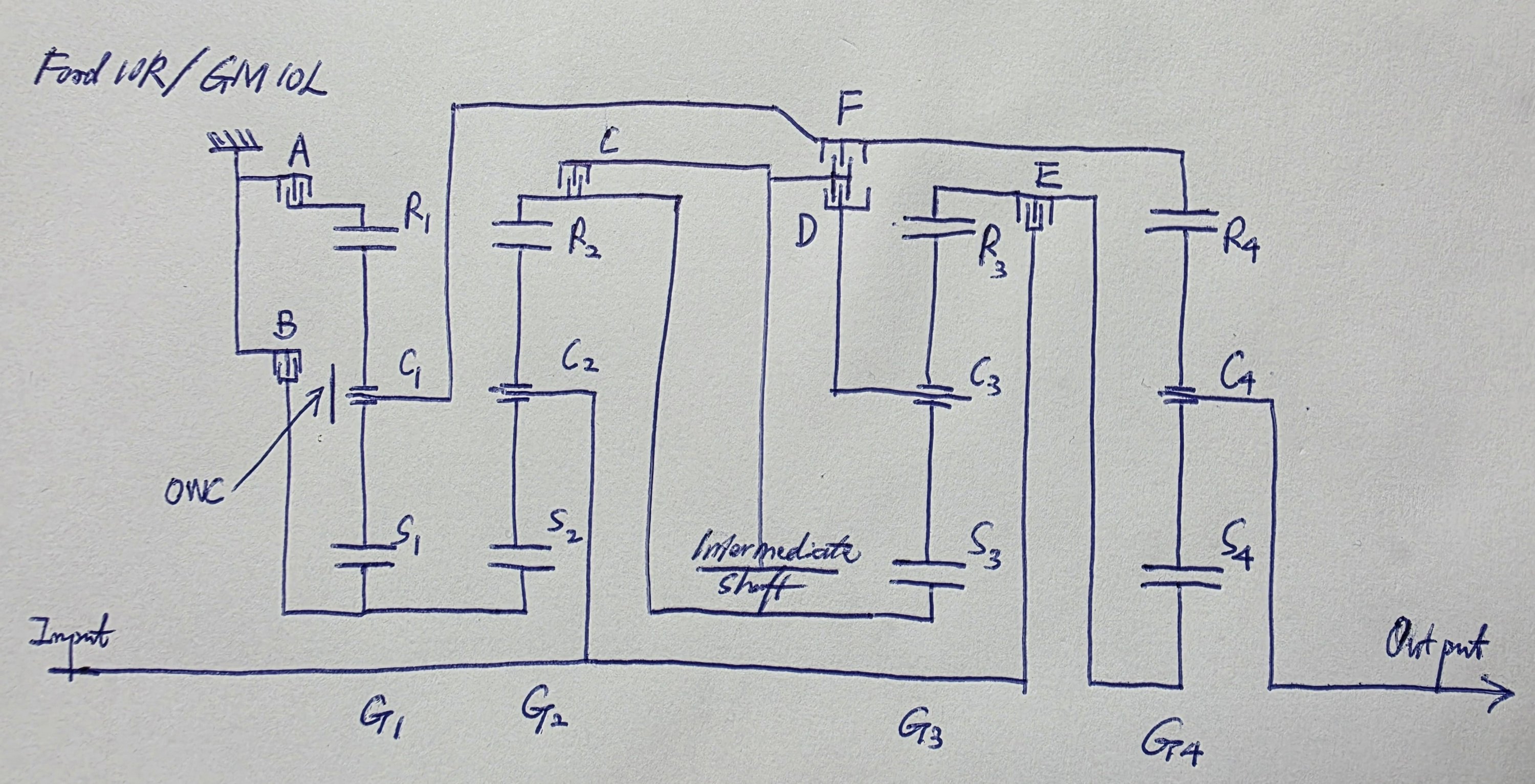 Now moving onto the gear train. This Ford design is clearly Inspired by the ZF 8HP. However, it is unfair to say that it is based on the latter. In this schematic that I drew, A and B are the brakes; C, D, E, and F are the clutches. There are four planetary gearsets, each with its sun gear, carrier, and ring gear marked out as Sx, Cx, and Rx. There is also a one-way clutch on C1. One point is worth noting: