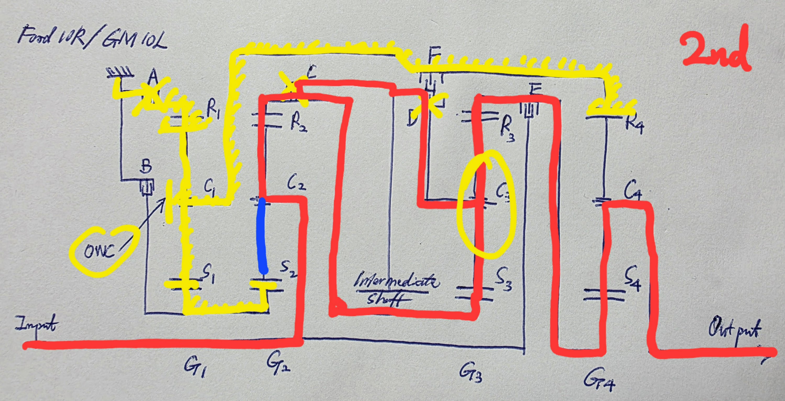In 2nd, torque goes through C2 > R2 > S3 > C3 > R3 > S4 > C4, with a parallel path of R2 > C > D > C3. This locks G3 as a unit. Speed increases in G2 but reduces in G4.