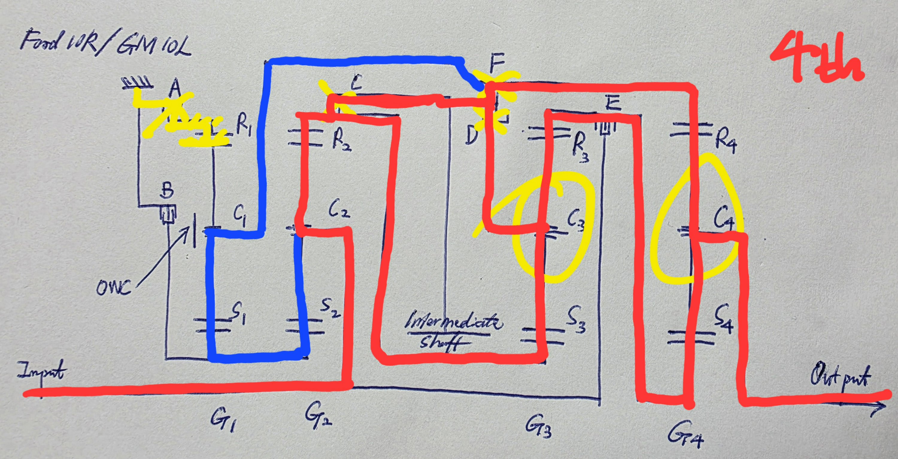 In 4th, torque goes through the many parallel paths as shown. Like in 3rd, engaging C and D locks G3. Further engaging F also locks G4. Thus, the only speed changes take place in the two front gearsets. G1 is the restraint, because engaging A slows C1 down.
