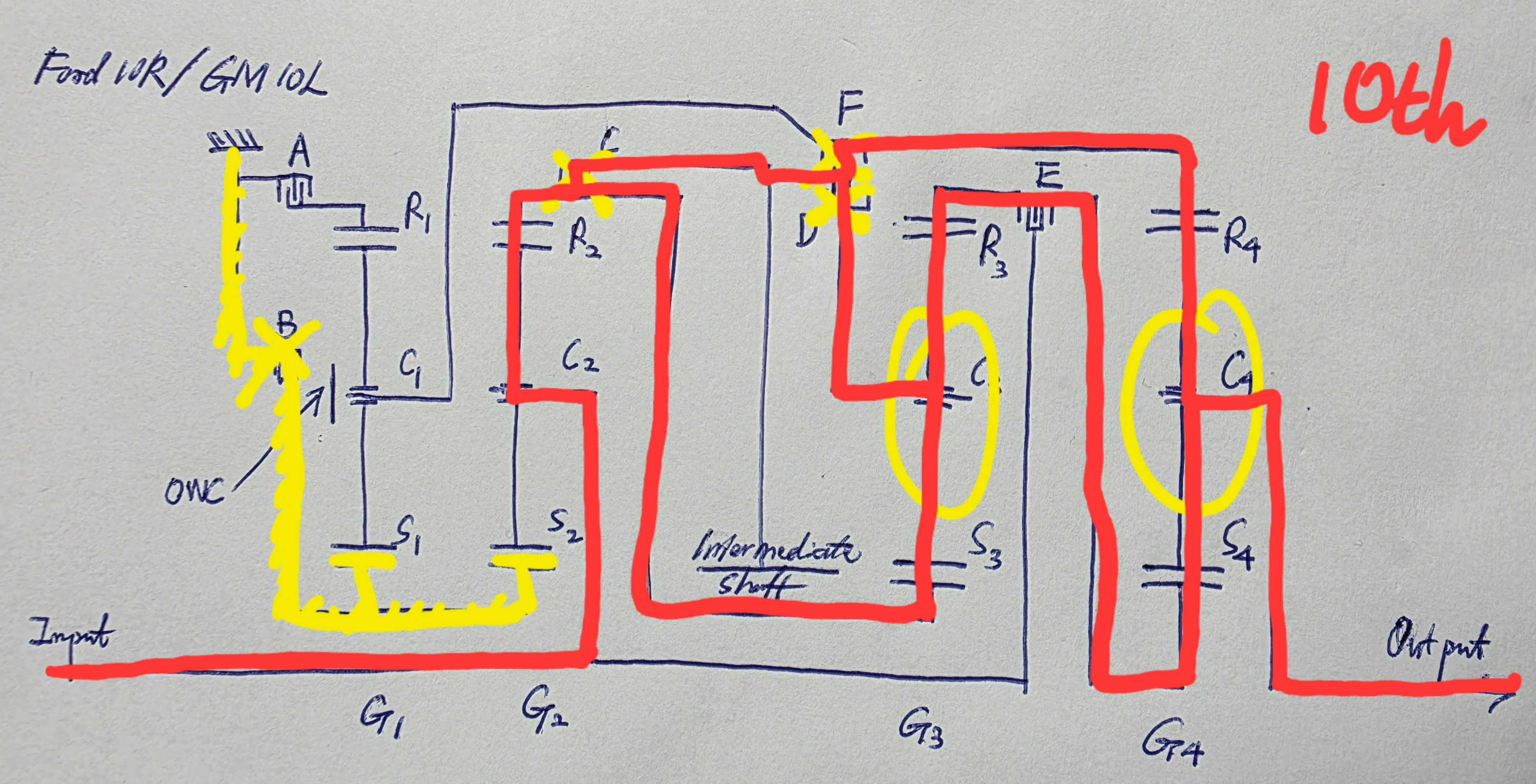 In 10th, torque goes through the many parallel paths as shown. Again, this gear locks G3 and G4. Speed only increases in G2.