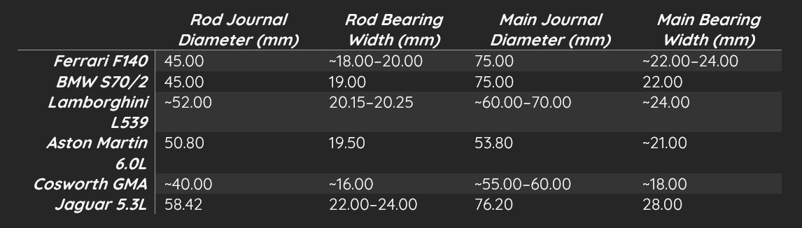 Main bearings do less work than rod bearings. The decision becomes a trade between stiffness and loss. For a small-displacement, road-going V12, a 54mm main bearing diameter is a good balance.