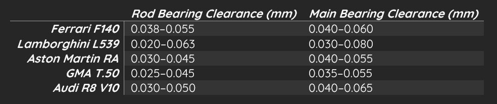 Hence, for something that can rev to 12k RPM, we should aim for 0.6 to 0.8 thousandth of the journal diameter. At the same time, since our car is designed for street use and will mostly run under 10k RPM, I believe choosing the upper end of this range is sensible. This is how I arrived at 0.038mm for both rod and main bearing clearances.
