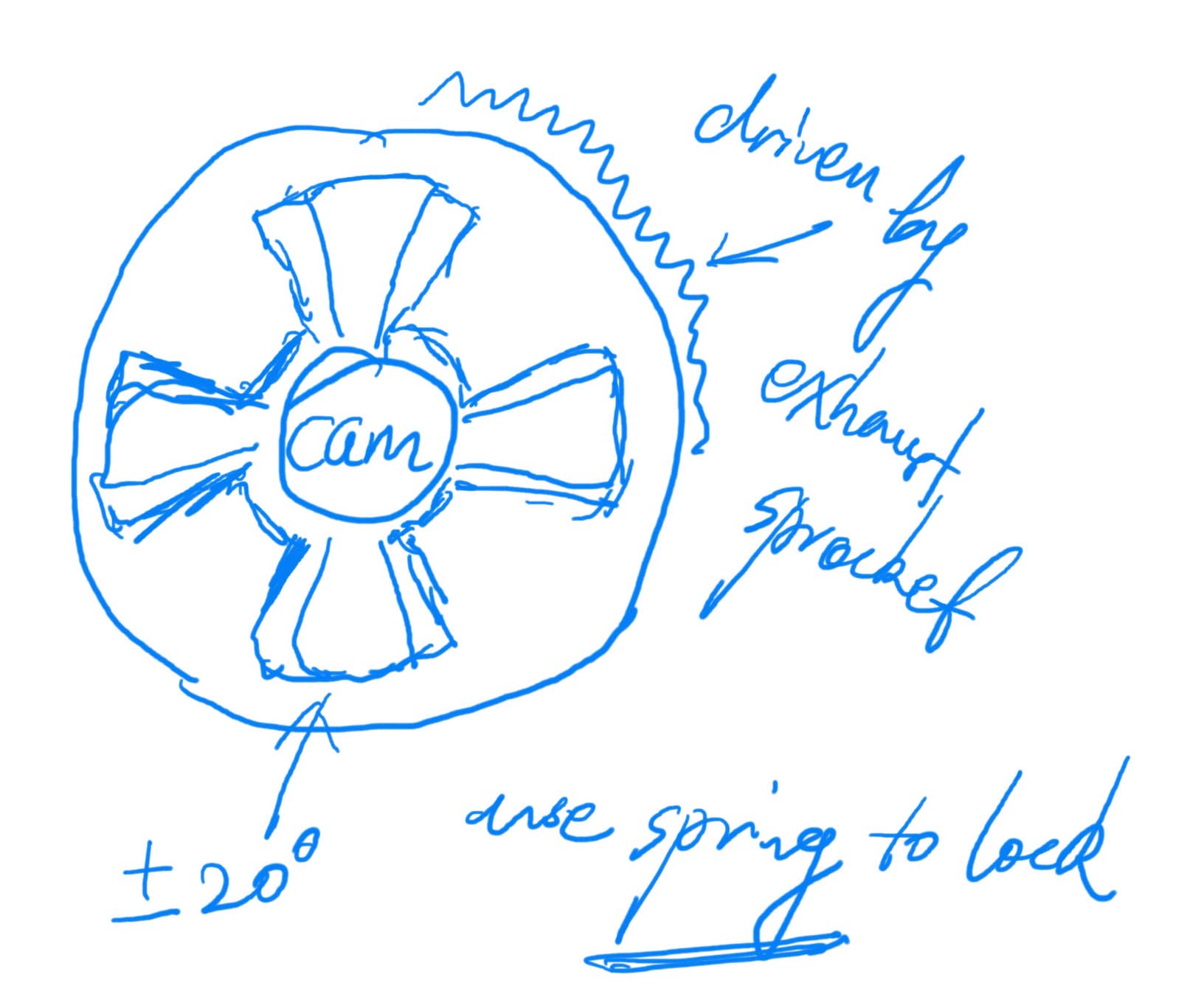 Nevertheless, we do not need extreme amount of adjustability found in certain German engines, because our small displacement, naturally-aspirated, port-injected engine with Nikasil coating is already fuel-efficient and knock-resistant. A small amount of VVT solely for the intake cams will suffice, with probably a 30° overlap as the default and 20° either way as the range.