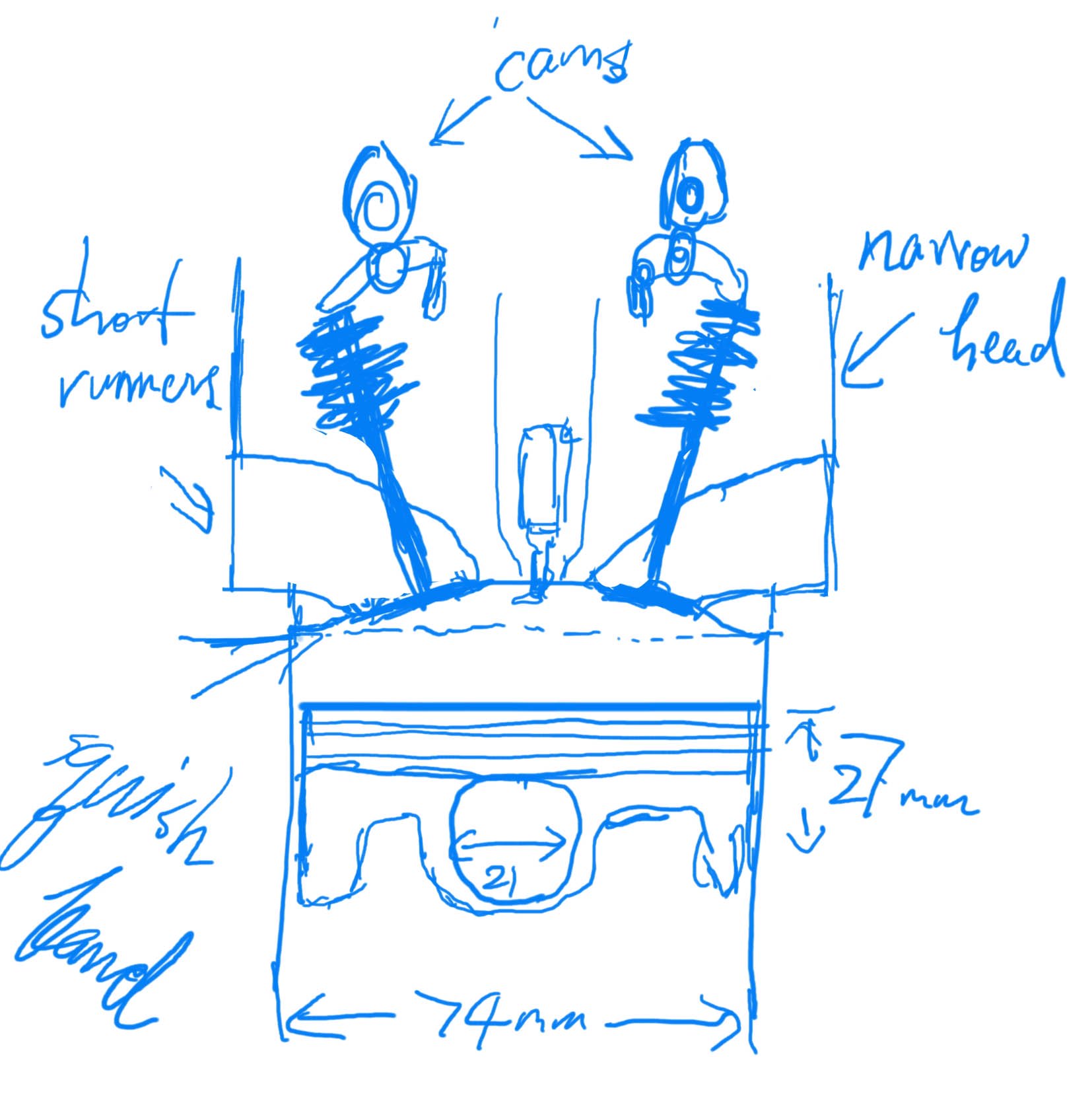 - Shallow combustion chamber: Small, 30% squish band, Central spark plug, 40° valve angle (20° per side) *need engineering