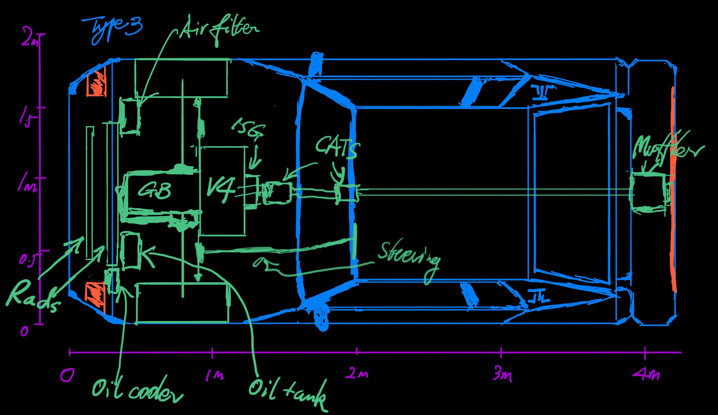 Previously, I have presented the design of a 2L 90-degree V4 with a hot-V electric-turbo, codename P4201T. Today, let us examine one of the many unique vehicles that this engine can power: a front-mid engine, front-wheel drive compact hot hatch with double wishbone front and rear suspensions. It may be one of the most characterful and most enjoyable cars ever envisioned. Its chassis code is Type 3.